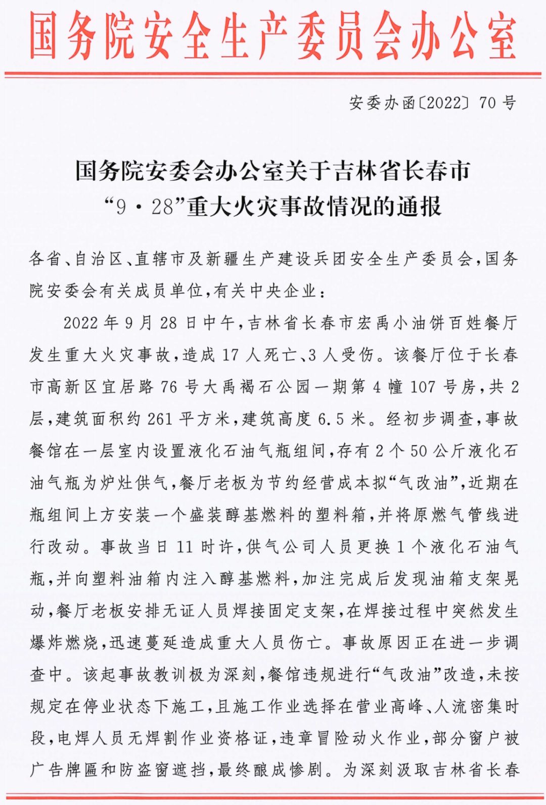 国务院安委会办公室关于吉林省长春市“9.28”重大火灾事故情况的通报