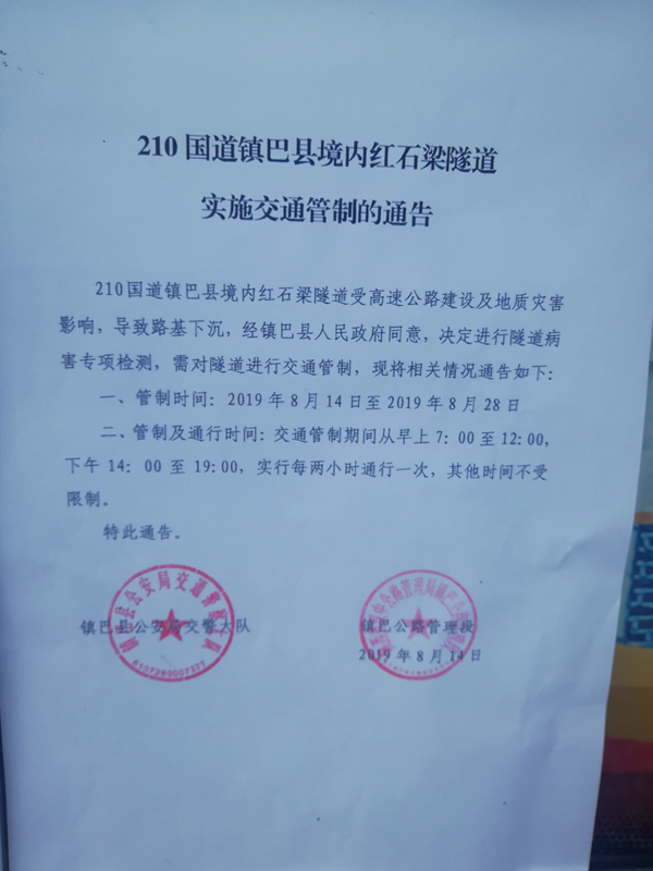 210国道镇巴县境内红石梁隧道K1620+825-K1623+688(旧桩号K1294+797-K1297+660)受高速公路建设及地质灾害影响,导致路基下沉,经镇巴县人民政府同意,决定进行隧道病害专项检测,需对隧道进行交通管制。管制时间:2019年8月14日至2019年8月28曰。交通管制期间从早上7: 00至12:00,下午14: 00至19:00,实行每两小时通行一次,其他时间不受限制。