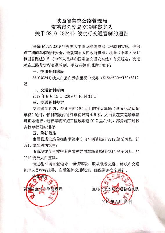 接省局通知:2019年8月15日至2019年10月31日,宝鸡公路管理局对S210麟留线(G244)K156+500-K189+351(太白县白云乡至汉中交界)段进行养护大中修及隧道整治工程,交通管制期内,禁止三轴(含)以上的货运车辆 (含危化品运输车辆)通行,管制路段内通行车辆限高4.5米,太白县蔬菜运输车辆可正常通行,施工路段限速20公里/小时,部分施工路段实行单幅限时通行。请限行车辆从212省道、316国道绕行。