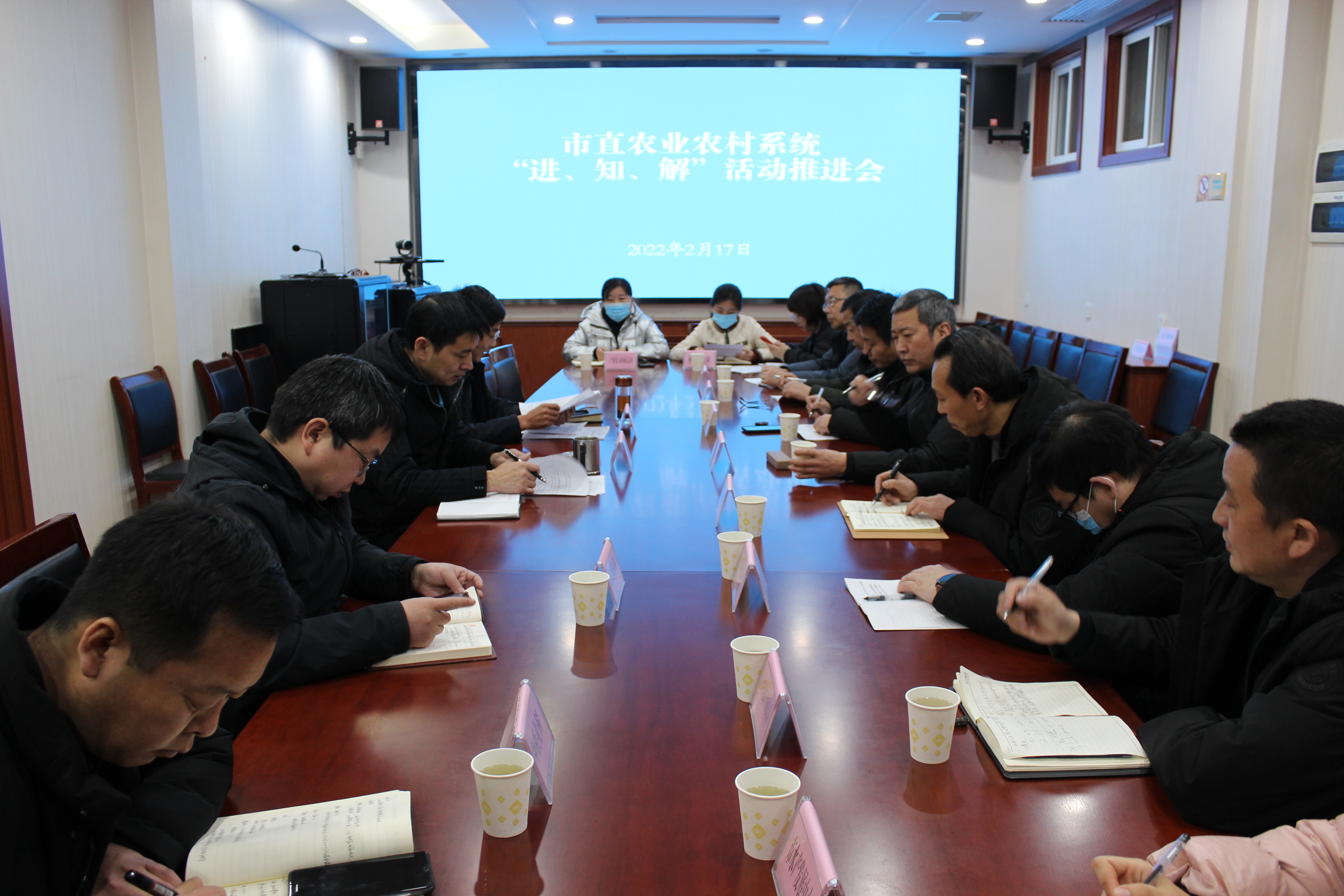 2月17日上午,市农业农村局召开市直农业农村系统“进、知、解”活动推进会,传达全市“进、知、解”活动工作座谈会议精神,对系统常态化开展“进、知、解”活动进行了安排部署。局属各单位负责同志和相关科室负责人参加了会议。