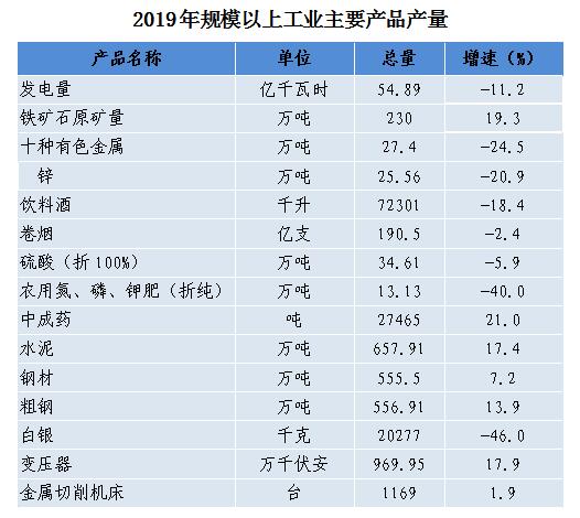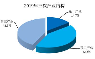 生产总值中,第一、第二和第三产业增加值占比分别为14.7%、42.8%和42.5%。与2018年相比,第二产业增加值占比下降4.9个百分点,第一产业、第三产业增加值占比分别提高0.7个、4.2个百分点。
