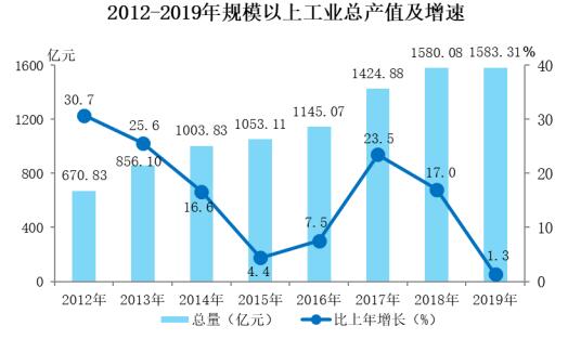分行业,规模以上工业36个大类行业中25个保持增长,其中8个行业增幅超过20%。分产业,规模以上工业中,装备制造工业完成产值420.94亿元,比上年增长10.2%;高品质食药工业完成产值441.46亿元,下降2.5%;现代材料工业完成产值505.45亿元,下降1.5%;能源化工工业完成产值155.38亿元,下降5.1%。高新技术工业完成产值375.54亿元,增长2.2%。
