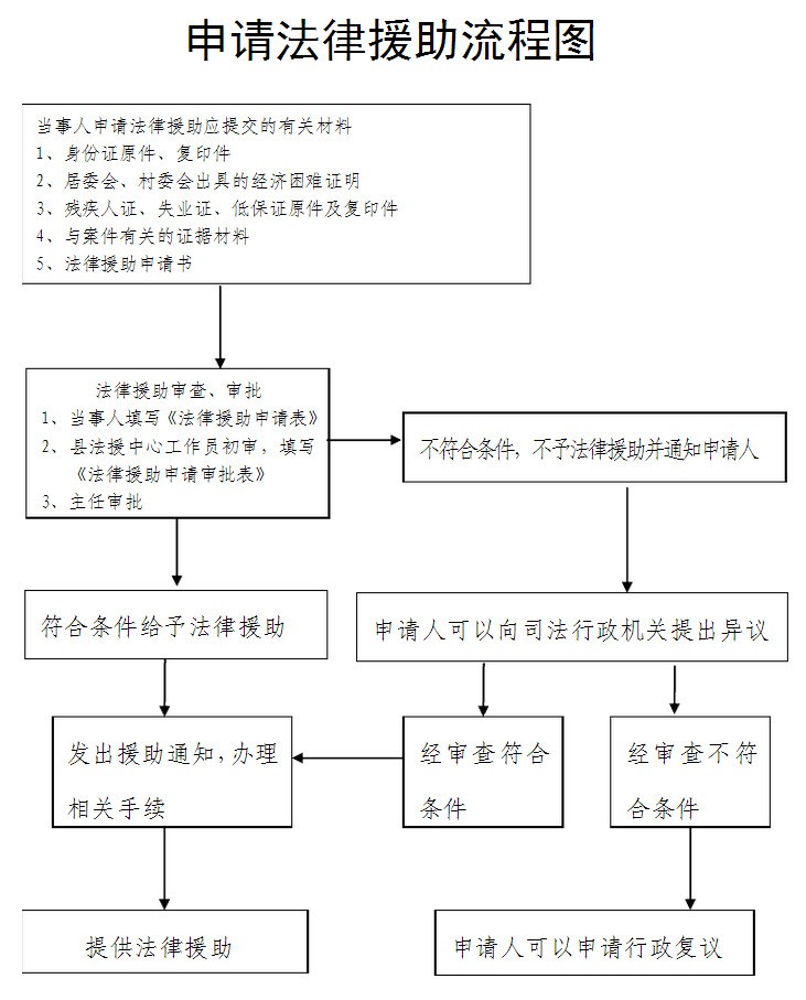 | 办理材料 | 公民申请法律援助的,应当提交下列证明及材料: (一)居民身份证或者其他有效的身份证明; (二)城乡居民最低生活保障证或者所在工作单位、乡(镇)人民政府、街道办事处出具的申请人及家庭经济状况的证明; (三)申请法律援助事项的相关证据材料。 |
