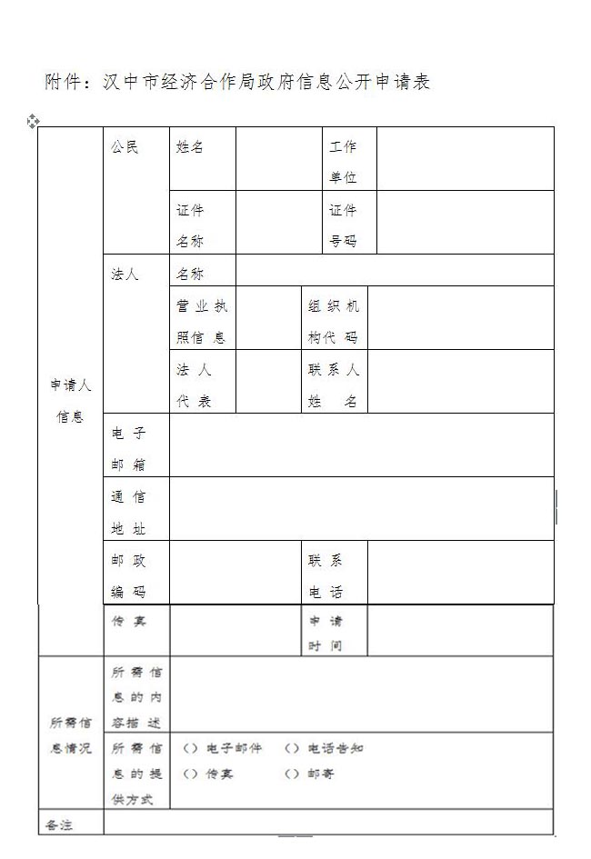 向本机关提出政府信息公开申请的,应当填写《汉中市经济合作局政府信息公开申请表》(见附件)。《申请表》复制有效,可以在受理机构领取,也可以在网站上下载。