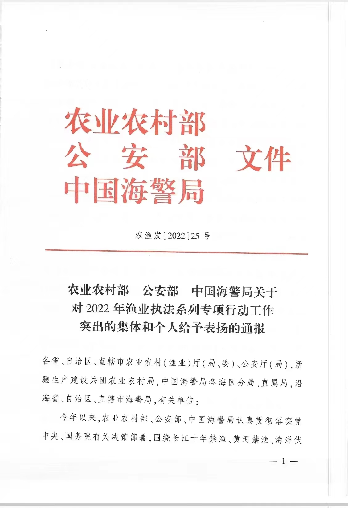 农业农村部、公安部、中国海警局关于对2022年渔业执法系列专项行动工作突出的集体和个人给予表扬的通报
