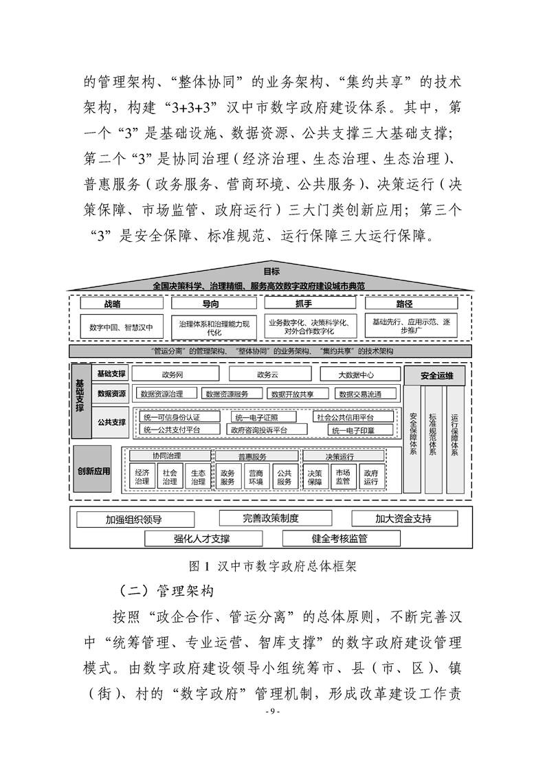 《规划》由发展基础、总体要求、总体架构、主要任务、保障措施5部分组成。(一)发展基础:汉中数字政府建设取得的成效以及存在的不足,同时从国内外、我省、我市四个维度概述数字政府建设所处的发展环境。(二)总体要求:1.指导思想。围绕全市“13469”发展战略和“绿色循环·汉风古韵”总定位,以“四个在汉中”为总抓手,把建设透明高效的数字政府作为推动经济高质量发展、再创营商环境新优势的着力点和突破口,全面开启数字政府发展新篇章。2.基本原则。坚持以人为本、惠企利民,整体规划、统筹共建,协同治理、开放共享,机制保障、安全可控。3.发展目标。将汉中打造为我省决策科学、治理精细、服务高效的数字政府建设城市典范。(三)总体架构:按照“363”的建设思路统筹推进365bet英国_365易贷官网_365bet登录地址数字政府建设。(四)主要任务:1.从基础设施、数据资源、公共支撑三个方面夯实数字政府基础支撑。2.从经济调节、市场监管、公共服务、社会治理、生态保护、政府运行六个方面拓宽数字政府创新应用。3.从标准规范、安全保障、运行保障三个层面完善数字政府安全运维。(五)保障措施:加强组织领导、完善政策制度、加大资金支持、强化人才支撑、健全考核监督。