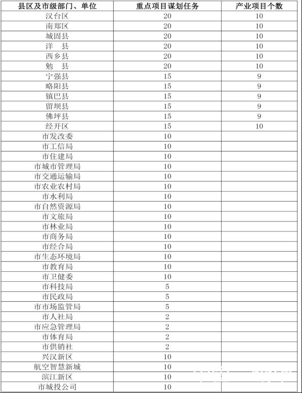 (三)全力推进重大项目谋划工作,确保项目接替有序。2020年,各县区、市级有关部门、单位新谋划总投资5000万元以上的单体项目任务如下:平川县区(汉台、南郑、城固、洋县、西乡、勉县)20个(1亿元以上项目5个、5亿元以上项目5个、10亿元以上项目3个),其中产业类项目不少于10个;山区县(宁强、略阳、留坝、镇巴、佛坪)15个(1亿元以上项目5个、5亿元以上项目2个),其中产业类项目不少于9个;经开区15个,产业类项目不少于10个;市级有关部门、单位谋划任务数分别为:发改委、工信局、住建局、城管局、交通局、农业农村局、水利局、文旅局、自然资源局、林业局、商务局、经合局、生态环境局、教育局、卫健委各10个,兴汉新区、航空智慧新城、滨江新区、市城投公司各10个,科技局、民政局、市场监督管理局各5个,人社局、应急管理局、体育局、供销社各2个。完成项目谋划的认定条件为:提供项目建议书、可研报告、规划文本等印证资料,同时谋划的项目必须是各县区、市级部门“十三五”规划和固定资产投资项目库以外的新项目。