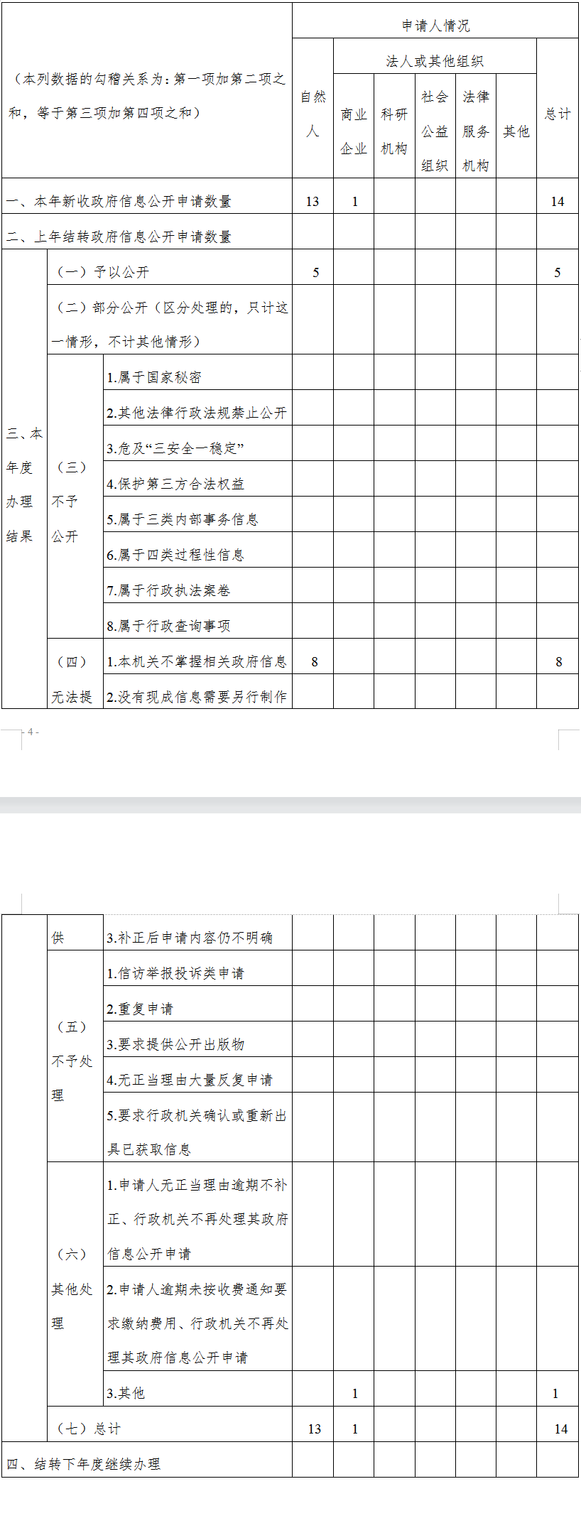 截至2022年12月31日,我局共收到政府信息公开网络申请14件,其中“不属于本机关信息”8件,“信息不存在”1件,其余5件均在受理期限内均予以答复。积极组织机关全体人员认真学习《政府信息依申请公开案例汇编》《陕西省政府信息依申请公开答复示范文本的通知》,切实提升业务办理的规范性。